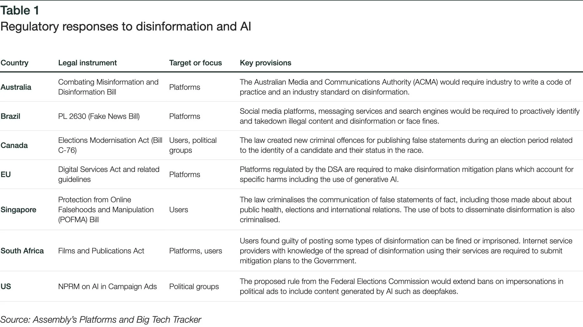 As detailed in our Disinformation Policy Benchmark within our Platforms and Big Tech Tracker, governments and regulators around the world have proposed and enacted a range of policy responses to disinformation in the past five years. Most recently, these policies have been amended to also encompass specific responses to the use of AI in creating false or misleading content as well. Though these efforts each target the same phenomenon, the limits of a jurisdiction’s existing legal framework for online safety and content moderation tend to dictate the reach of its disinformation regulation. Among countries which have adopted policies specifically aimed at disinformation, regulation tends to either target individual users who may create or share disinformation, the platforms on which disinformation is hosted or political campaigns and groups creating advertisements and sponsored electoral content (see Table 1).