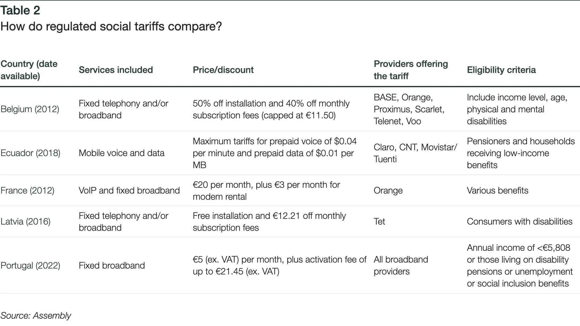 Some regulators have introduced mandated social tariffs for connectivity, such as in Belgium, Ecuador, France, Latvia, and Portugal. These interventions represent a direct alternative to operators’ own initiatives; however, evidence suggests they face the same problems with awareness and uptake.