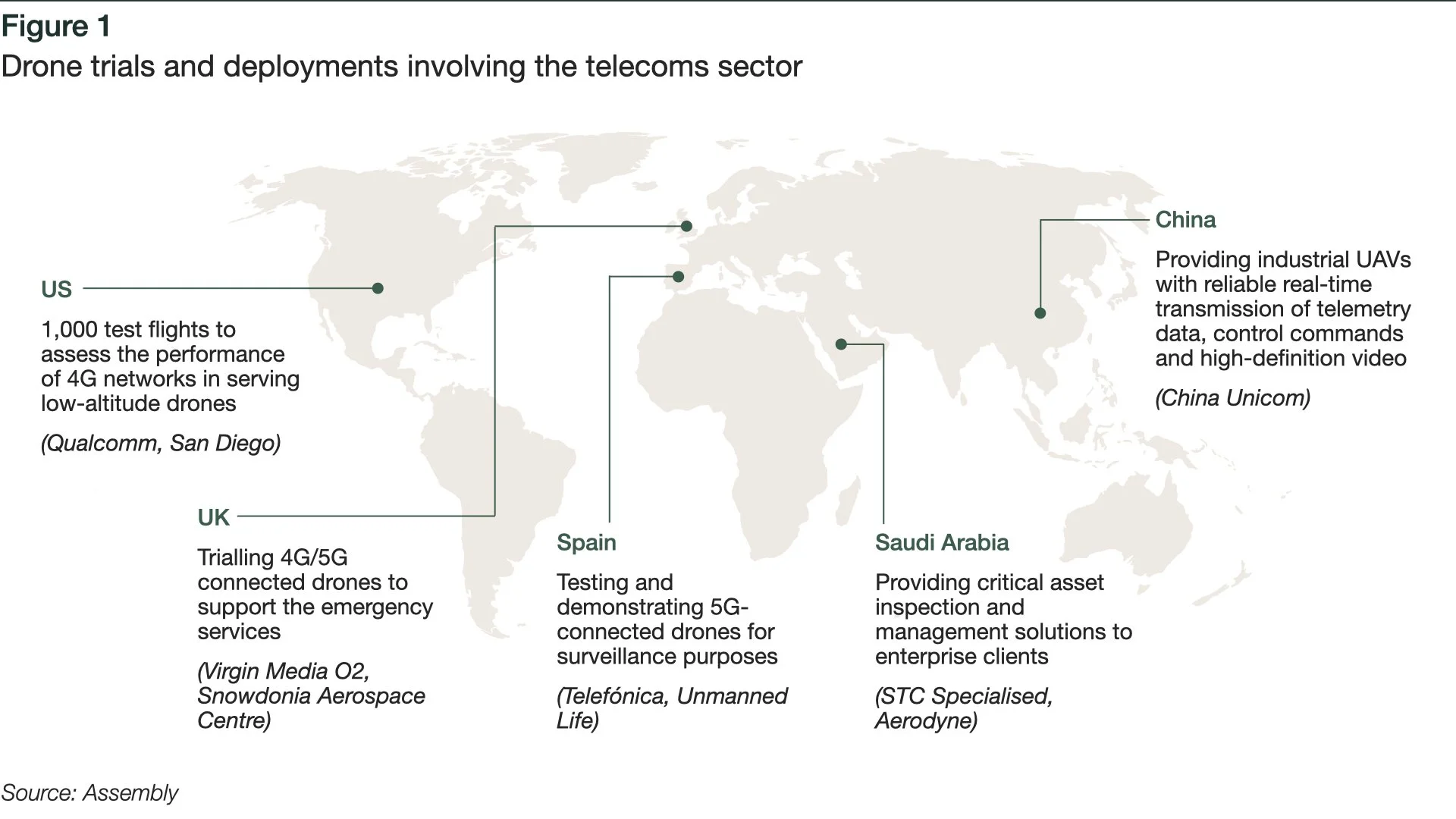 Drones, often referred to as unmanned aerial vehicles (UAVs), have witnessed a surge in popularity over recent years, with vendors such as DJI, Parrot and Yuneec increasing sales significantly in their domestic markets and overseas. Drones are currently being used for a variety of purposes, including recreational flights, the transport of medical supplies and emergency search and rescue situations. The telecoms sector is increasingly engaged in drone trials, often providing the connectivity that underpins an initiative (see Figure 1). During the course of the decade, the global market for drones is projected to expand considerably due to rising demand from private, commercial and government users, with North America seen as particularly lucrative.