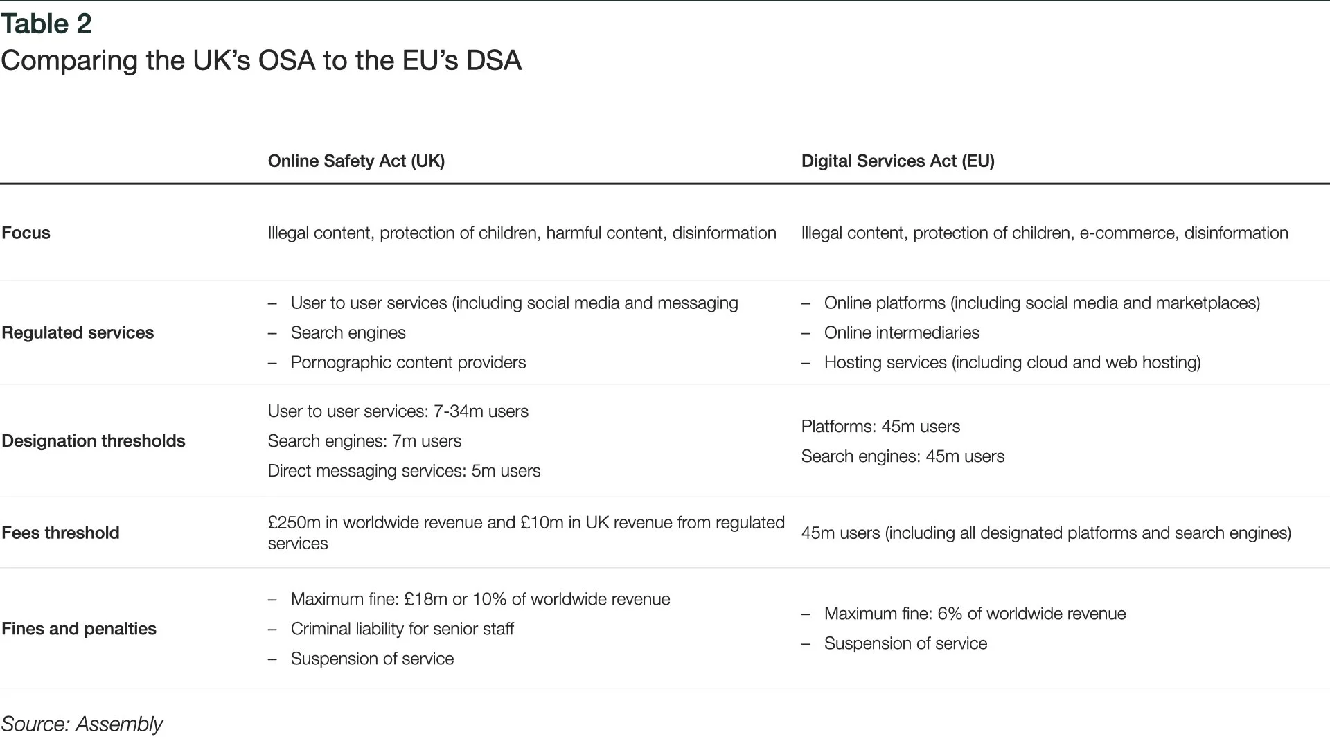The UK law engages more deeply with perhaps a narrower scope of online safety than the EU’s Digital Services Act