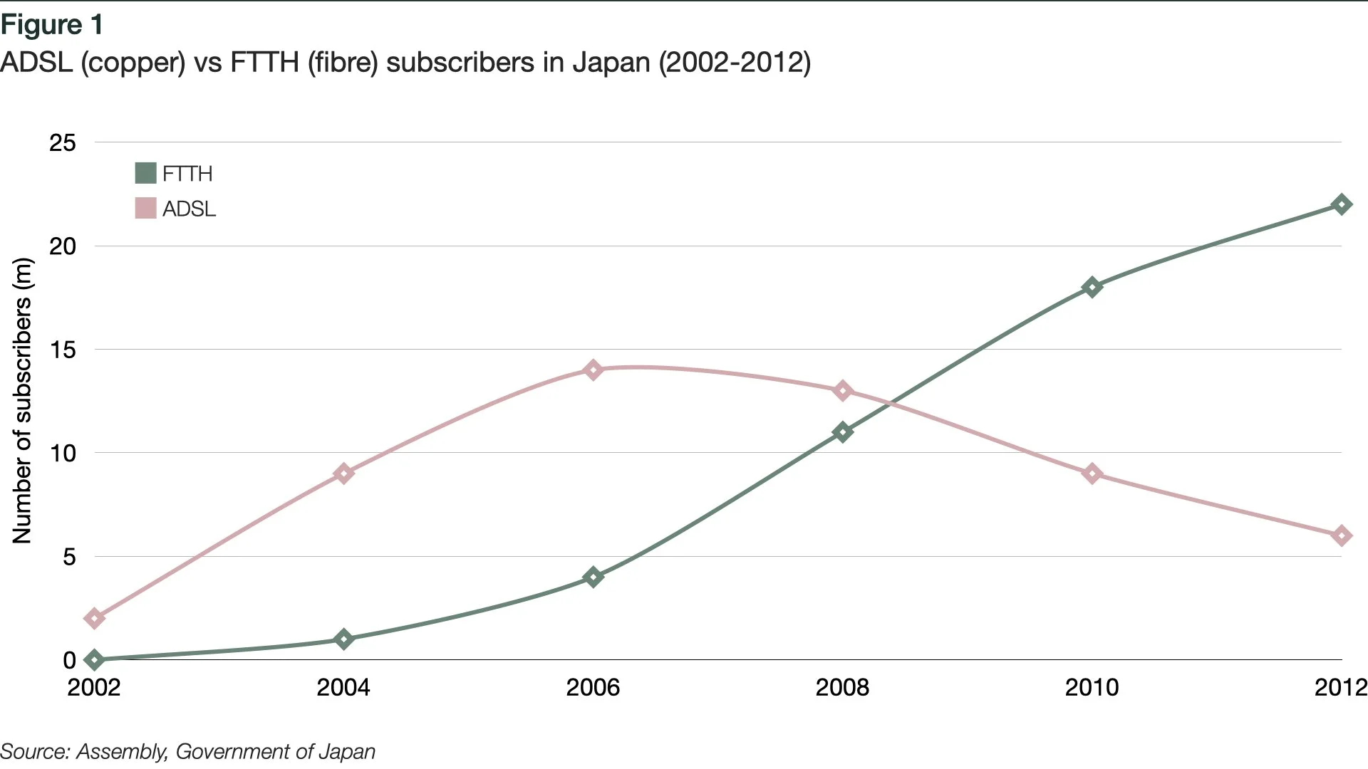 In the early 2000s, a number of governments sought to kickstart growth in their economies through measures to support investment in advanced technologies by the telecoms sector. In particular, Japan and South Korea’s approaches to public spending on, and regulation of, the industry led to an accelerated pace of fibre deployment and migration of end users away from copper networks.