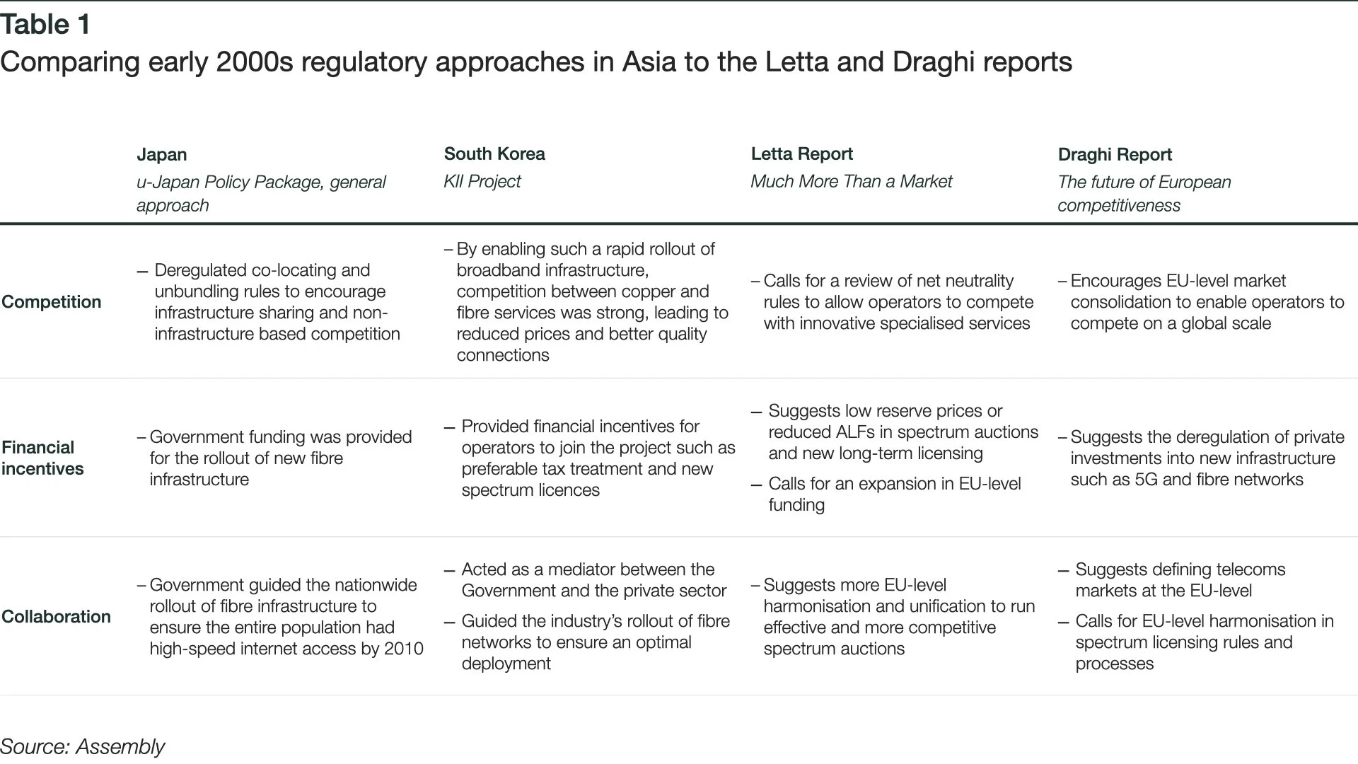 Nevertheless, there are calls for regulators to go further and to reduce the perceived burden on operators that it is argued currently shackles investment. Both the Letta and Draghi reports recommended deregulation in a number of areas which, if implemented, would reflect the approaches taken in Japan and South Korea – see Table 1.