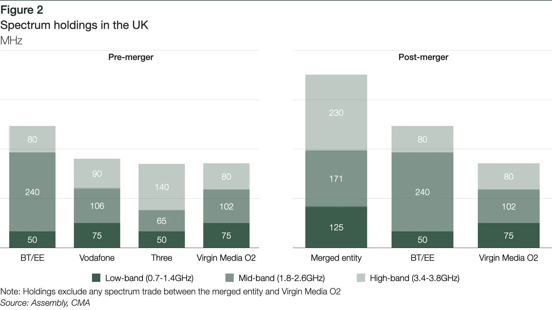 Spectrum was an issue many considered would be a focus of the CMA, particularly as it has been a source of concern in recent mobile mergers in other countries, with divestment a common remedy to secure approval. Post-merger, Three/Vodafone would own 46% of total spectrum below 6GHz, BT/EE would hold 32% and Virgin Media O2 would hold 22%. The biggest asymmetry would relate to valuable C-band spectrum (i.e. 3.4-3.8GHz), where Three/Vodafone would have 59% – see Figure 2. Regulators have typically aimed to ensure a reasonably balanced distribution of spectrum; however, this was mentioned only twice in the CMA’s Phase 1 decision summary. Despite the asymmetry between operators, the CMA’s Phase 1 decision did not explicitly highlight this as a major competition concern. It stated that mobile operators require a balance of spectrum to provide coverage and capacity, with the latter a key determinant of network quality, while recognising the scope for different spectrum holdings to influence an operator’s reliance on, or incentives to cooperate in or even frustrate, a network sharing agreement.
