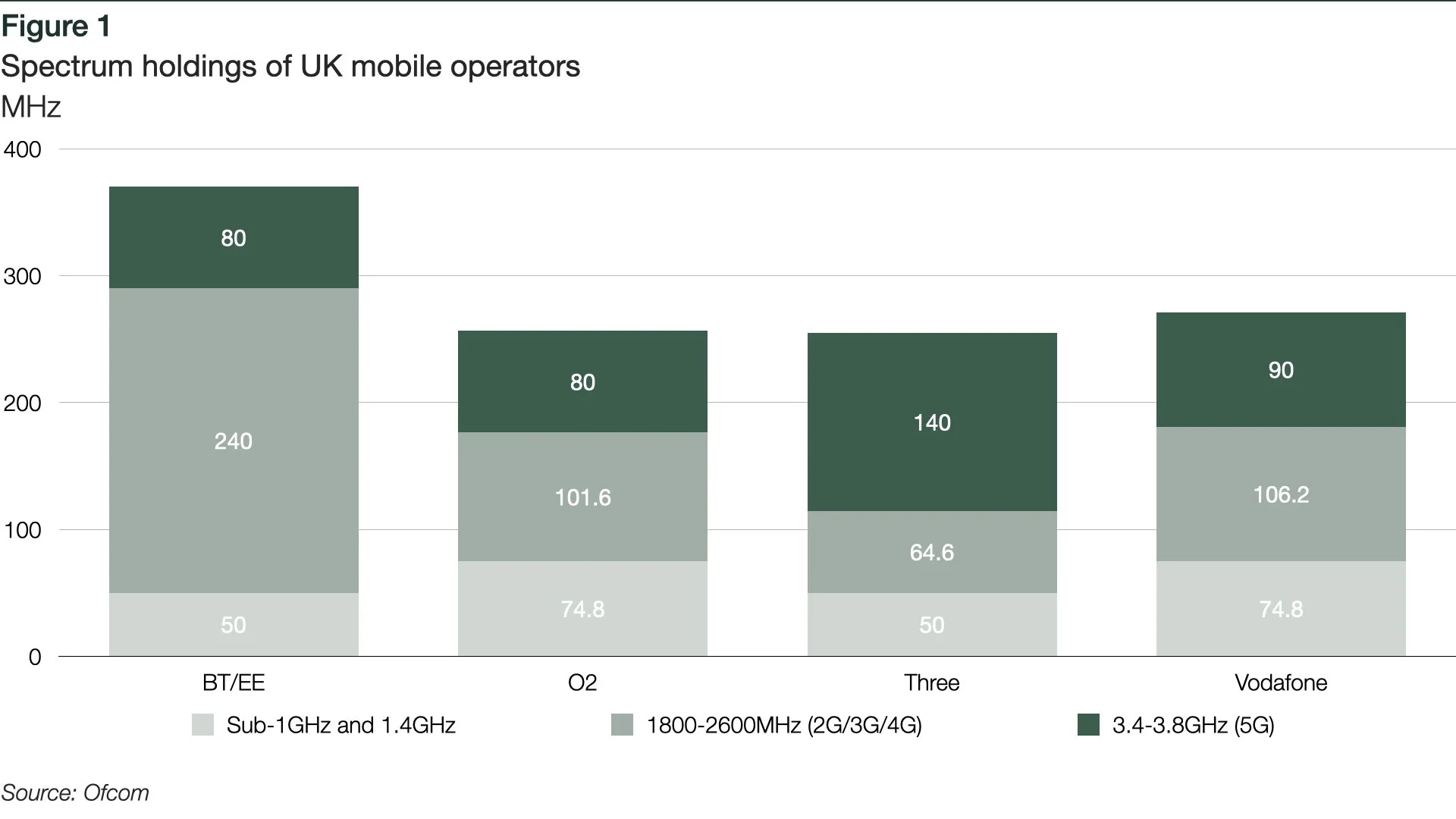 Aside from creating a new mobile market leader, a combined Three/Vodafone would boast a significant proportion of 5G spectrum in the 3.4-3.8GHz range. While spectrum was not one of the EC’s primary reasons for blocking O2/Three, mid-band (i.e. 1-6GHz) is a priority 5G range and may lead the CMA to consider the balance in assignments between operators and potential divestment options.