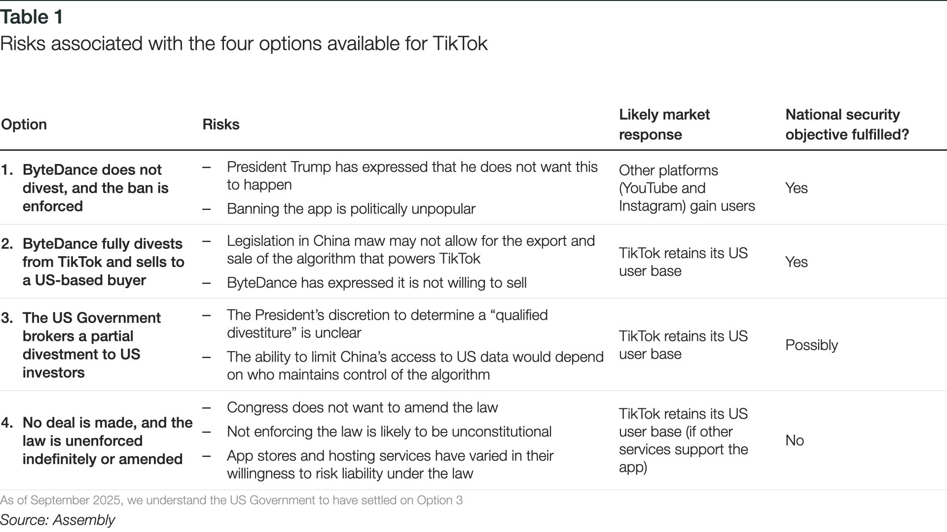 Despite the often repeated refrain of TikTok posing a national security threat to the US, the debate over the possible outcomes of the Protecting Americans from Foreign Adversary Controlled Applications Act as well as the final agreement on partial divestiture have revealed a disconnect between stated motivations and the possible impacts of the law (see Table 1). Among the four plausible resolutions to the Government’s ultimatum to ByteDance, some of the identified risks, including the President’s authority to conclude the deal proposed, remain unsettled.