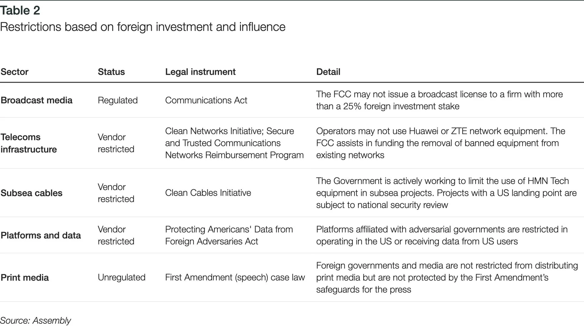 Throughout US history, restrictions on foreign ownership of and involvement in communications infrastructure have been common (see Table 2). Only in the case of broadcast media has the Government instituted a horizontal prohibition of significant foreign investment from any other country. Given the nature of spectrum as a scarce resource, the US justifies these restrictions as prioritising domestic firms’ access.