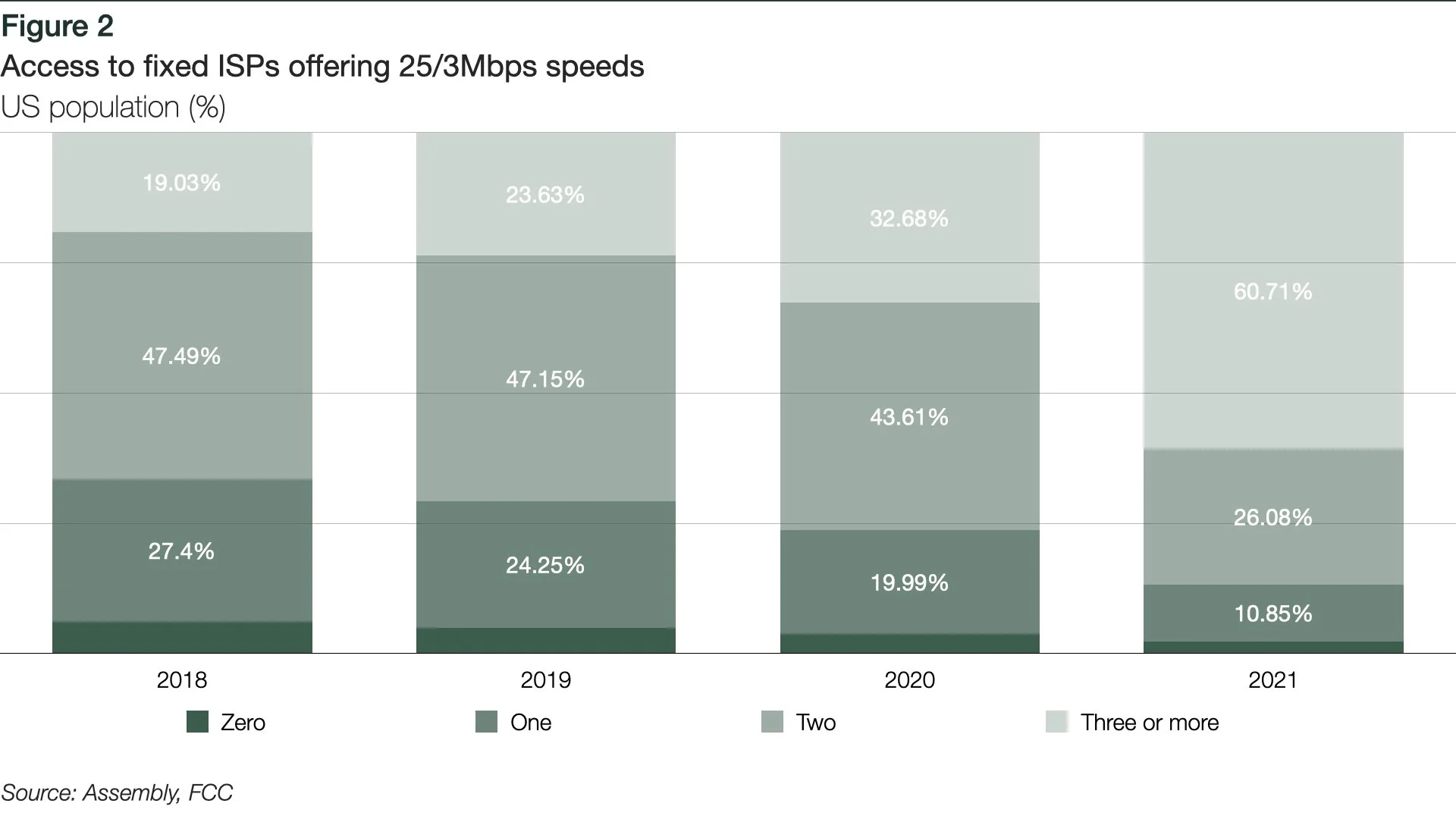 Comparatively, the US has seen this relationship between improved information for consumers and increasing competition work in the opposite direction. As more operators are able to provide more customers speeds that exceed the national minimum standard for connectivity (25/3Mbps), consumers have also benefited from the introduction of broadband “nutrition” labels required by the FCC on every tariff on offer. Since the majority of Americans gained access to three or more providers providing similar connectivity levels in 2021 (see Figure 2), these labels highlight points of comparison between tariffs on offer.
