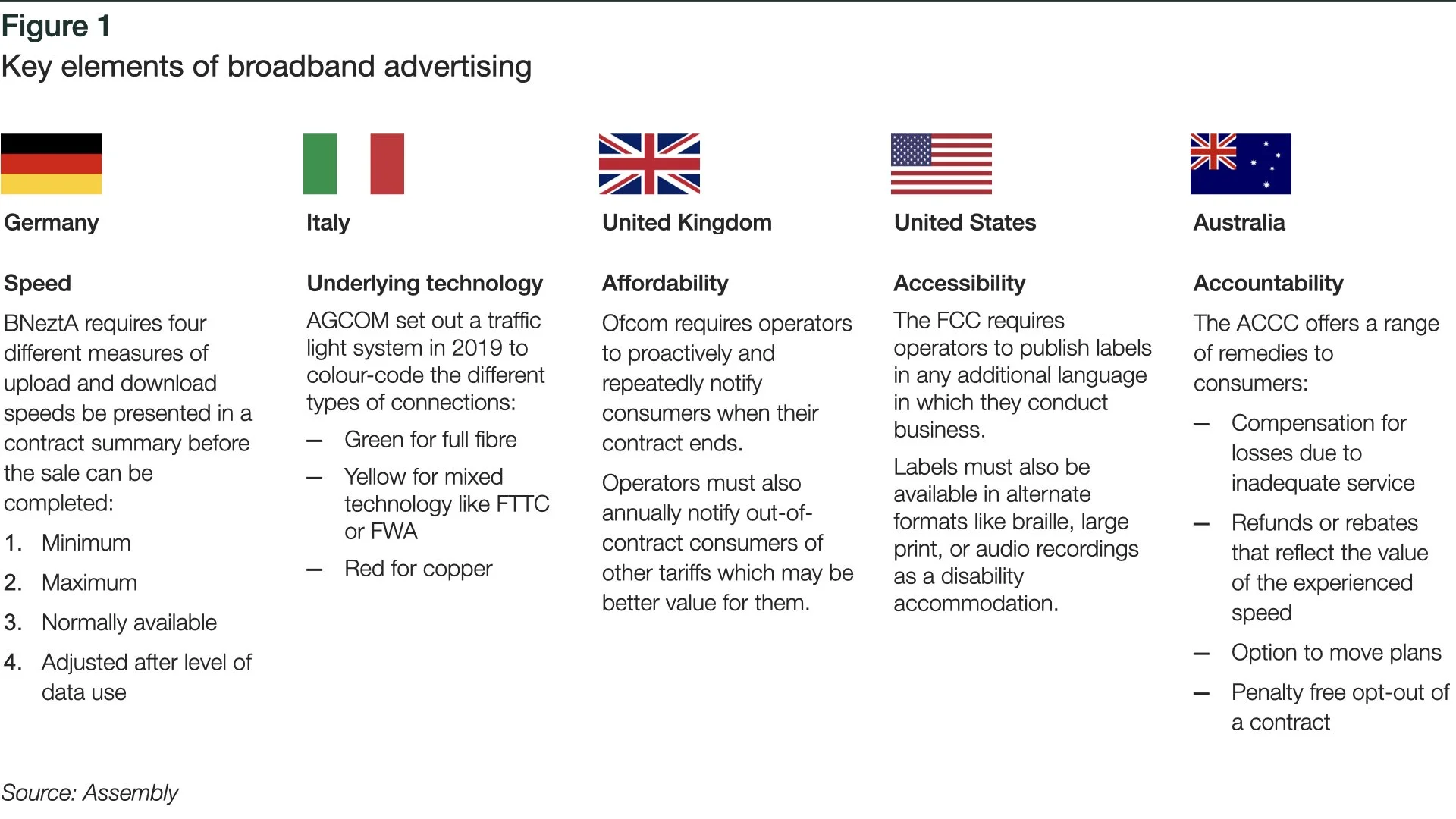 Broadband labelling and advertising rules bring greater transparency for consumers when comparing tariffs and choosing a service. We compare common elements of labelling schemes around the world and consider their relationship to competition in the market.