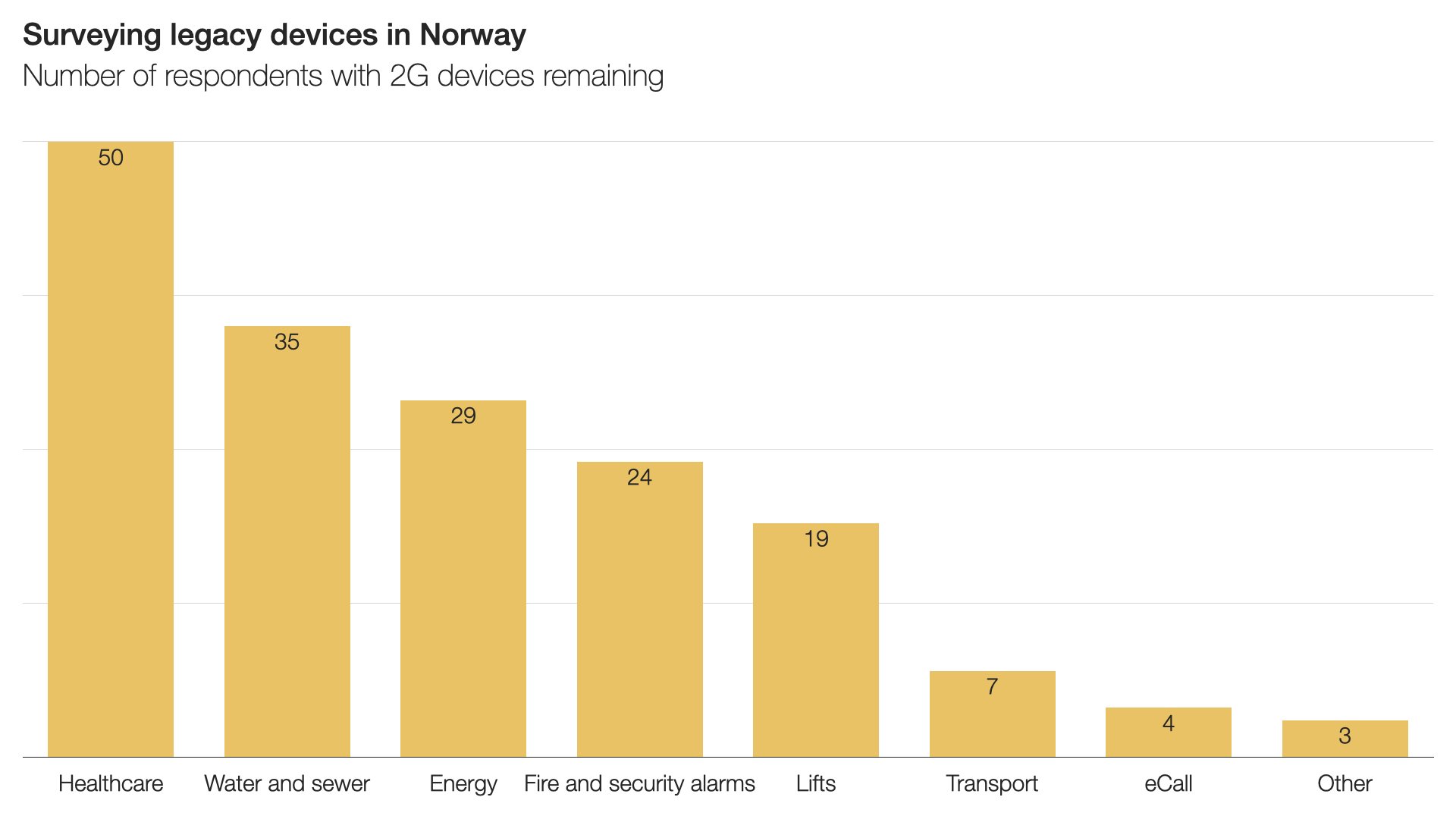 In its report, Nkom finds that most relevant stakeholders have a plan to transition from legacy equipment and, in instances where that is not yet the case, there are readily available solutions that could be adopted. Summarily, the regulator does not believe there is cause to intervene before Telia’s shutdown process begins and emphasises that the operator’s phased approach will allow for learning and adjustments along the way. Among the public and private sector respondents to Nkom’s survey, the healthcare, energy and water and sewerage sectors reported having the highest number of legacy devices still in operation. These stakeholders generally reported that delays in their migration were due to plans to phase out legacy devices altogether, concerns that the quality of 4G coverage could not match 2G coverage and issues with managing the financial burden of replacing devices. Nkom found that a majority of stakeholders with remaining legacy IoT devices use Telenor’s network (and therefore have additional time to complete migrations) and that the stakeholders which do use Telia services are largely aware of the pending shutdown and have plans to migrate services. For the few respondents without plans for migrating devices with Telia SIMs, the operator is working to proactively follow up to support timely transitions.