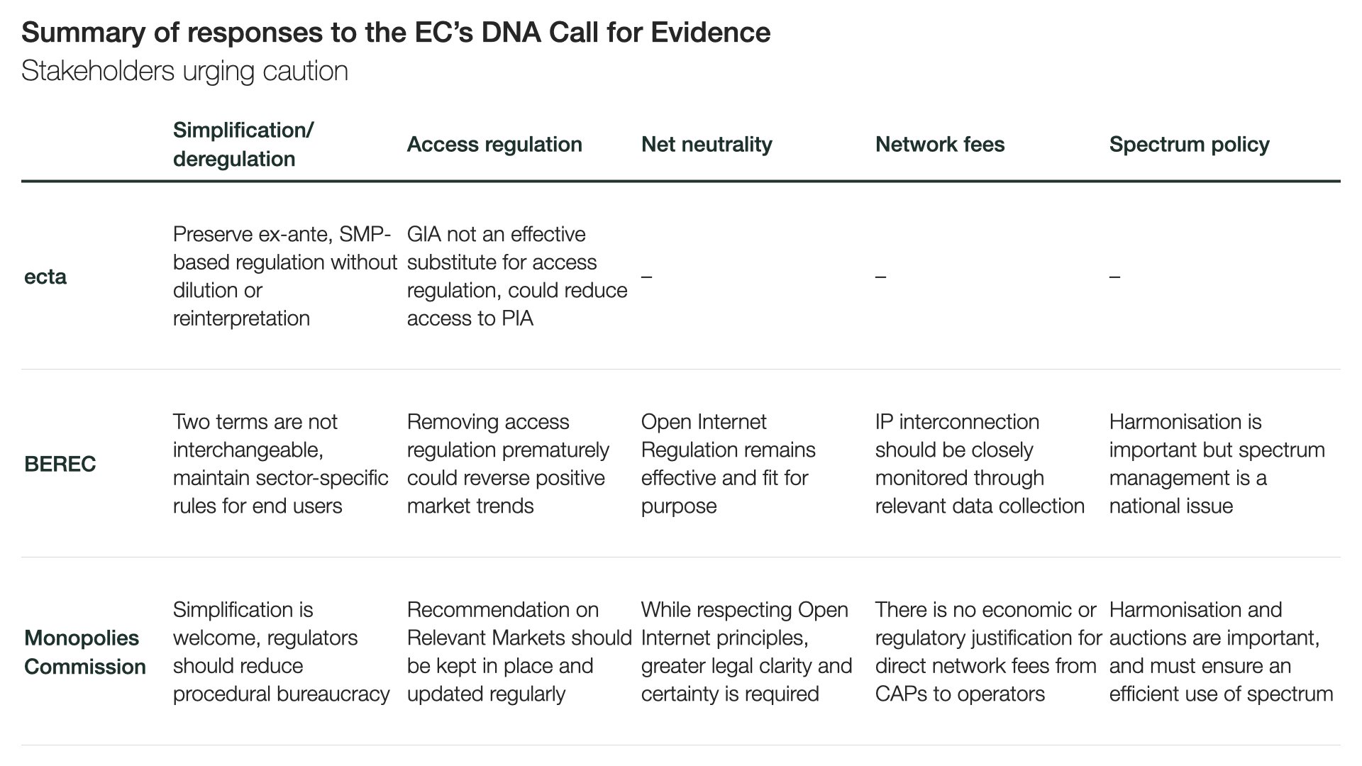 The EC’s Digital Networks Act (DNA) Call for Evidence has attracted significant attention, generating 326 separate responses from interested parties. Having analysed input from several key stakeholders, it is unsurprising to see Connect Europe, Orange and Telefónica aligned in their desire to see considerable deregulation, including the removal of ex-ante access obligations, as well as a new binding requirement on large tech firms to negotiate with telecoms operators for IP interconnection services (the advancement of the so-called ‘fair share’ debate). Meanwhile, the European Competitive Telecommunications Association (ecta) has stressed the importance of access regulation, urging the EC not to dismantle the current system in favour of “vague, untested alternatives”. Regulators (the Body of European Regulators for Electronic Communications (BEREC) and Germany’s Monopolies Commission) are similarly unenthusiastic that the EC might remove ex-ante regulation. While there is some agreement with Europe’s largest operators on simplification and on improving clarity around the Open Internet Regulation, neither BEREC nor the Monopolies Commission sees cause for mandated network usage fees. Both ecta and BEREC also highlighted the strong performance of the region’s telecoms sector (for example, in terms of levels of competition and investment), contradicting the line of argument presented by the EC over the past two and a half years.