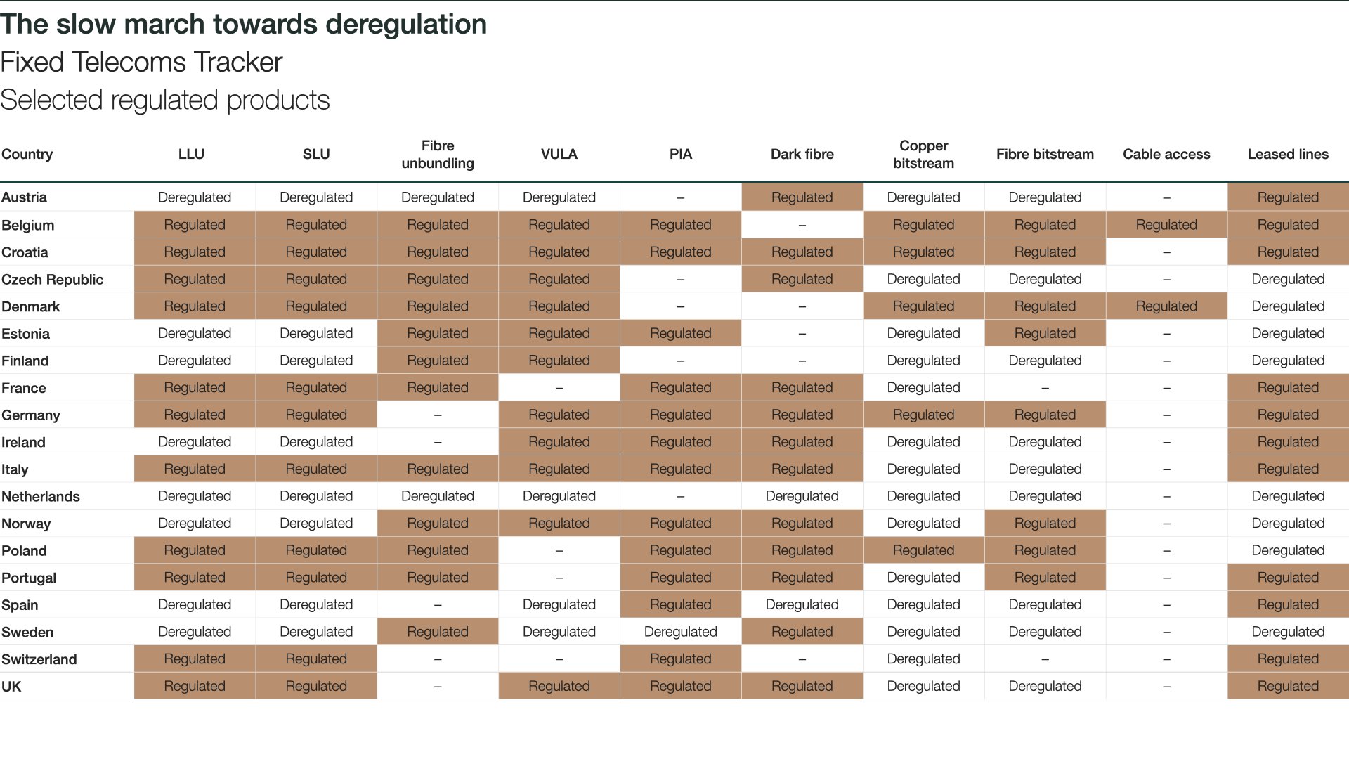 We’ve expanded our Fixed Telecoms Tracker to compare wholesale broadband access regulation across a wider set of countries. Our benchmark now includes details of regulatory decisions, drawing directly from the latest rounds of market reviews, for 19 European countries. Recent statements from several former incumbents, including Openreach in the UK, have stressed the importance of getting regulation right in order to support ongoing fibre investments – including removing obligations where competition is present. Our benchmarks show that, following the most recent analysis of wholesale local access (WLA) – Market 1 of the EC’s 2020 Recommendation on relevant markets, eight countries have now deregulated local loop and sub-loop unbundling (LLU/SLU), with a further four removing regulation in competitive geographic areas.